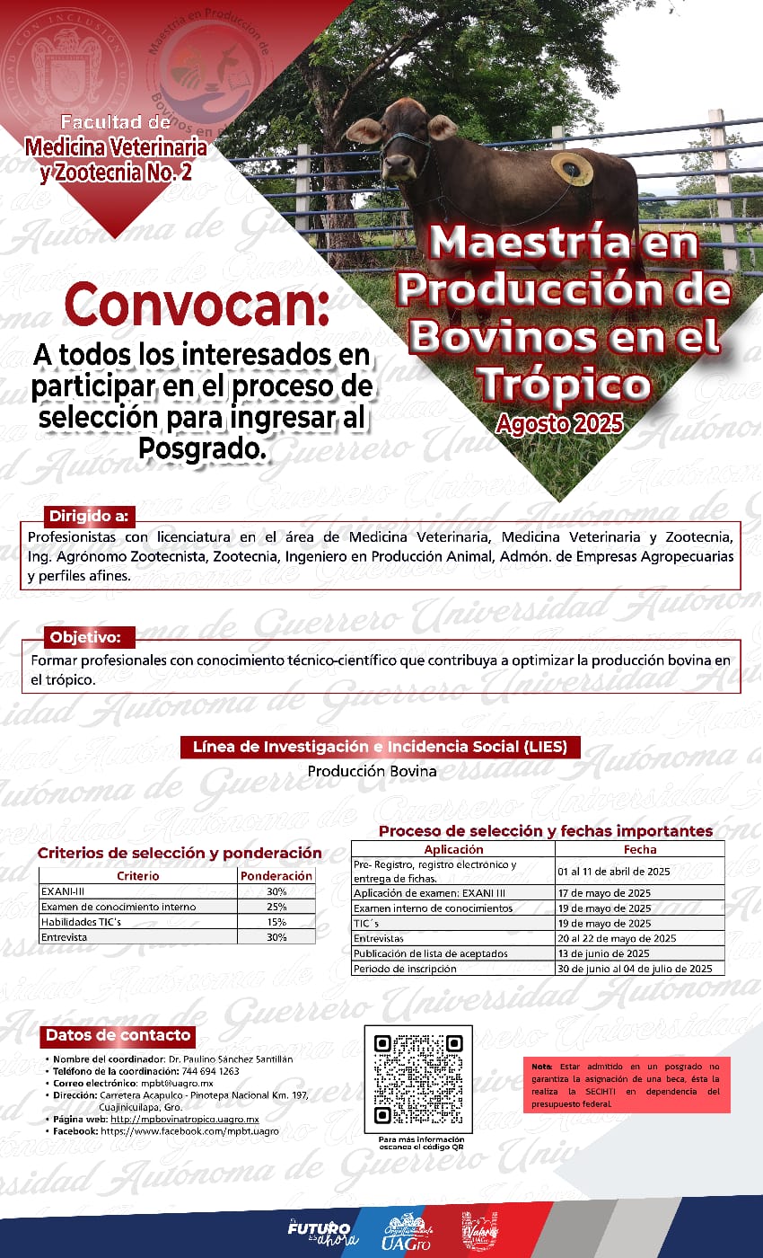 Bienvenid@s al sitio web de la Maestría en Producción de Bovinos en el Trópico (MPBT), programa de posgrado que tiene como objetivo la formación de profesionales con conocimiento técnico-científico que contribuya a optimizar la producción bovina en el área tropical. La MPBT es de orientación profesional y cuenta con profesores experimentados en el campo disciplinar e investigativo.